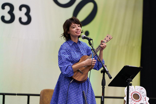 Kate Micucci, musician, comedian, and actress, led a reclaimed-art and sustainable ukulele demonstration, transforming discarded materials into new creative expression. “I started painting on discarded guitar tops that would’ve been thrown away otherwise,” Micucci shared. “Today reminded me that sustainability is about what we can do daily—and also about making something bigger and more impactful together. The ukulele I played today [a Martin T1 Tenor Uke] was totally sustainable.”